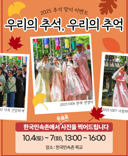 • 특징: 추석 연휴 시즌에 가장 활기찬 전통 체험 공간. 조선시대 마을을 그대로 재현한 공간에서 전통 공연과 민속놀이, 한복 체험 등을 즐길 수 있습니다. 명절 분위기를 제대로 느낄 수 있는 대표적인 전통 여행지.