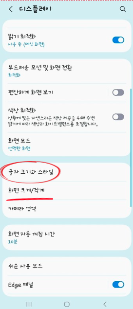 → ‘디스플레이(화면)’ 항목을 찾아 누릅니다. - 글꼴 스타일/글자 굵게 또는 글자 크기 선택